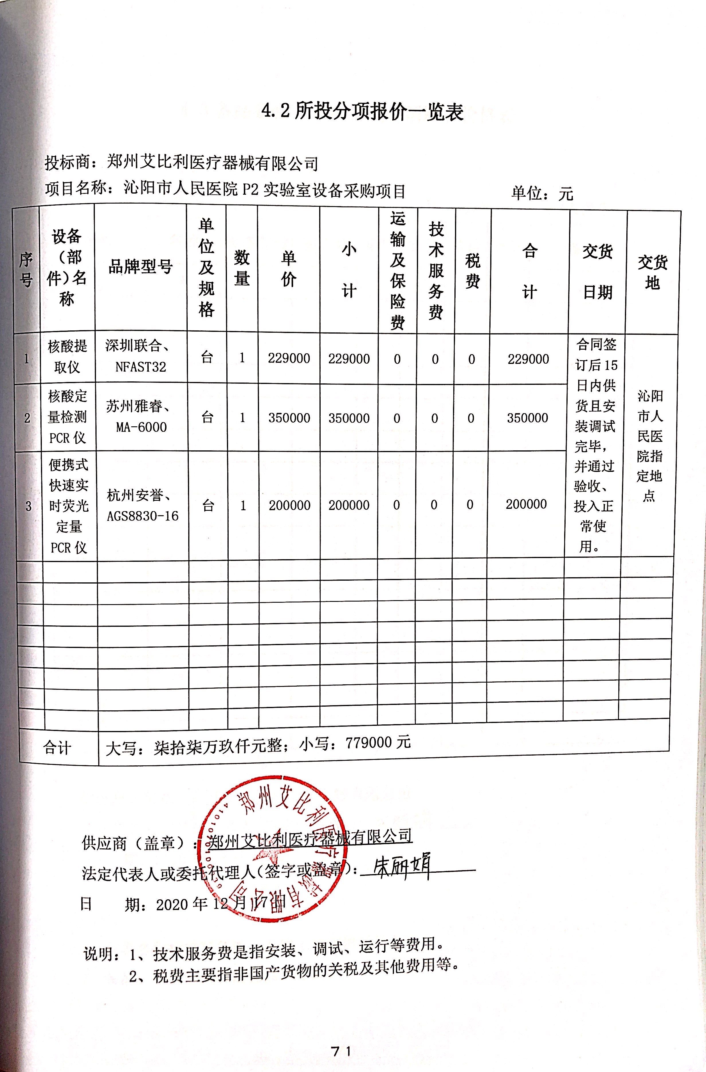 包2 | 核酸提取儀、核酸定量檢測PCR儀、便攜式快速實時熒光定量PCR儀 | 鄭州艾比利醫(yī)療器械有限公司 | 鄭州高新技術產(chǎn)業(yè)開發(fā)區(qū)蓮花街338號11號樓4層25號 | 779000.00 | 元 |