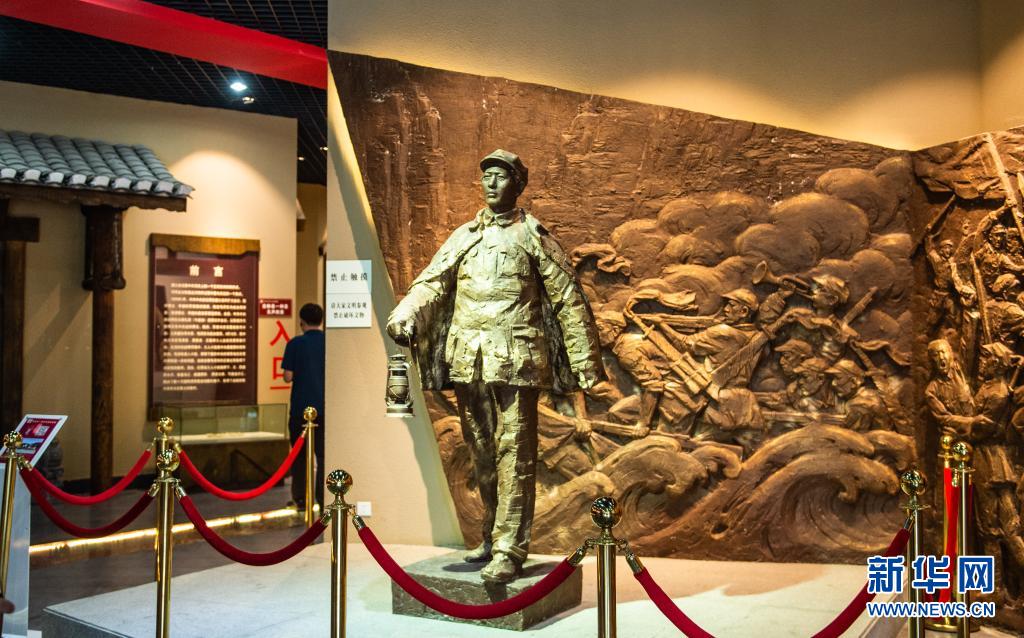 這是在茍壩會議陳列館拍攝的毛澤東身披外套、提著馬燈疾行的雕塑(2019年7月5日攝)。新華社記者 陶亮 攝