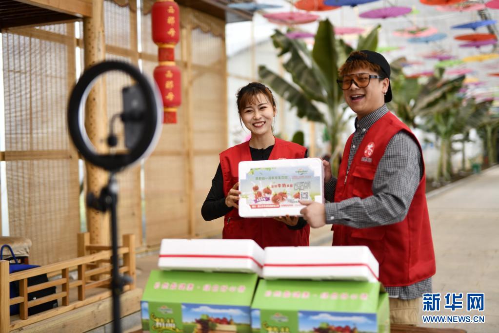 5月11日,工作人員在河北省唐山市豐潤(rùn)區(qū)西那母生態(tài)旅游度假村內(nèi)通過網(wǎng)絡(luò)直播的形式推介草莓。新華社記者 牟宇 攝