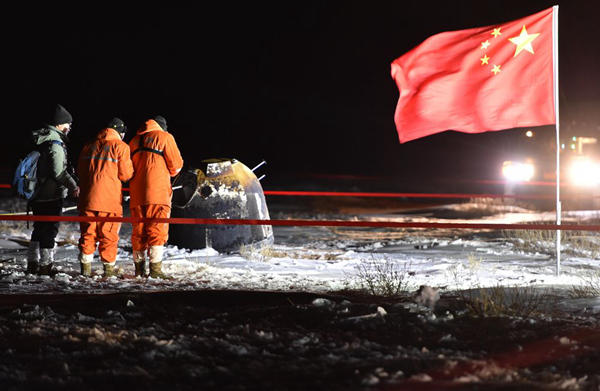 23天后的12月17日凌晨,內(nèi)蒙古四子王旗。在闖過月面著陸、自動采樣、月面起飛、月軌交會對接、再入返回等多個難關(guān)后,歷經(jīng)重重考驗的嫦娥五號返回器攜帶月球樣品,成功返回地面。