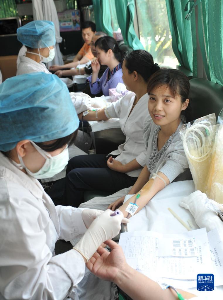 鄭州市委干部肖靜在流動(dòng)獻(xiàn)血車上獻(xiàn)血(2008年5月14日攝)。2008年5月14日,數(shù)百名鄭州市直機(jī)關(guān)干部職工參加援助活動(dòng),并為汶川地震災(zāi)區(qū)的受災(zāi)群眾獻(xiàn)血。新華社記者 趙鵬 攝