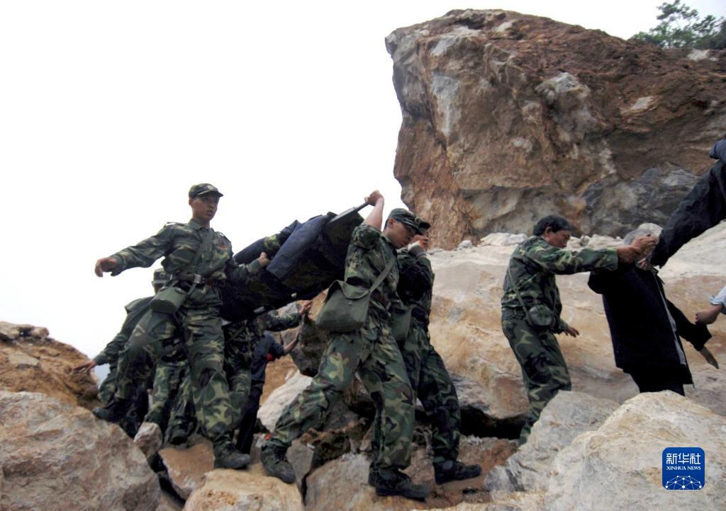 在四川省北川縣災(zāi)區(qū),武警戰(zhàn)士在救援受傷者(2008年5月13日攝)。新華社記者陳?ài)茢z