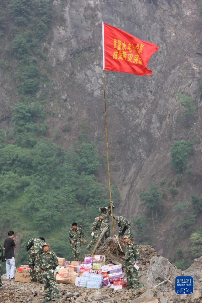 武警水電部隊(duì)官兵把紅旗豎起在唐家山堰塞湖搶險(xiǎn)前沿(2008年5月26日攝)。新華社記者李剛攝