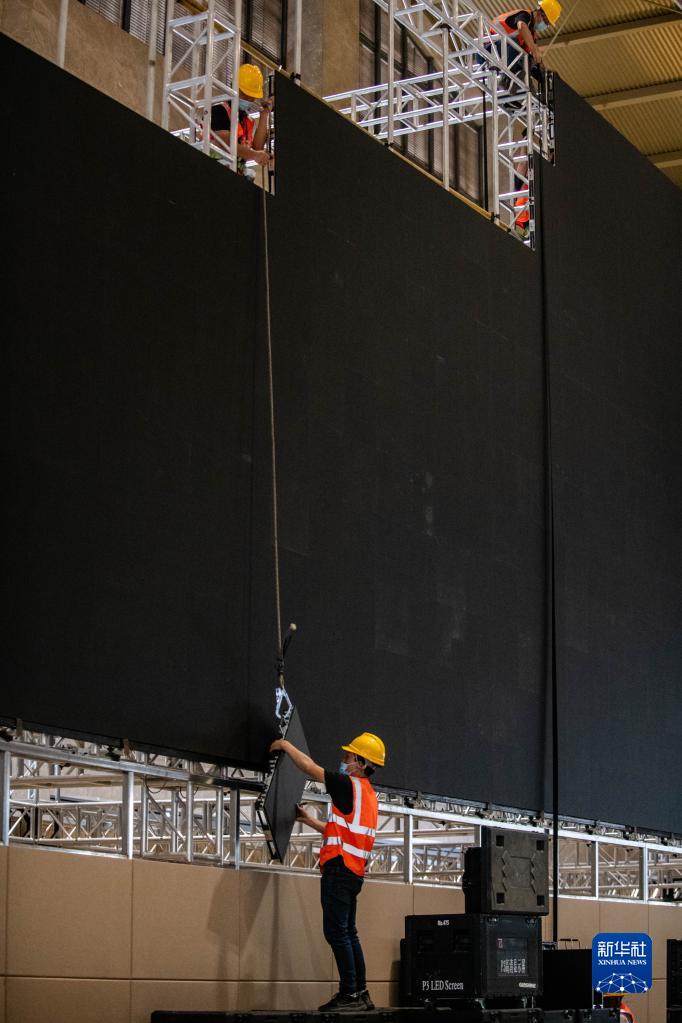 在昆明滇池國際會展中心,工作人員正在搭建會場和新聞中心。施工人員均已接種兩劑新冠肺炎疫苗,每天進場還要測體溫、戴口罩。會場相關(guān)設(shè)備將使用可重復(fù)利用的材料,會場不進行油漆粉刷、噴涂,也不鋪設(shè)地毯。