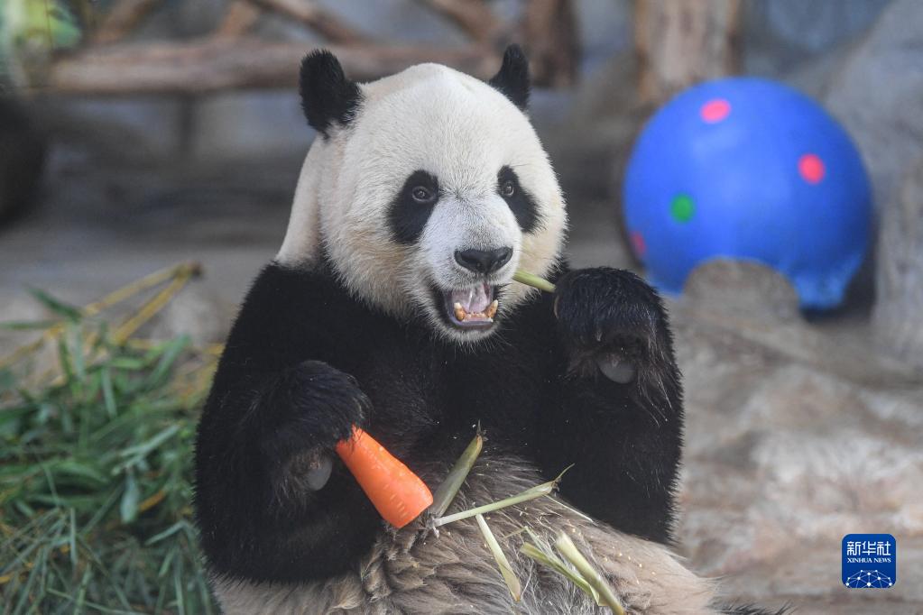 在位于??诘暮D蠠釒б吧鷦又参飯@,大熊貓“舜舜”在享用美食(6月14日攝)。新華社記者 蒲曉旭 攝