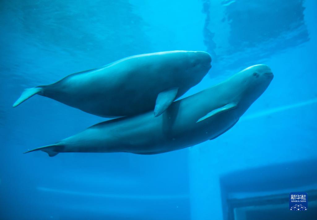 在位于武漢的中國科學院水生生物研究所,長江江豚媽媽和小江豚在水中游動(7月5日攝)。新華社記者 肖藝九 攝