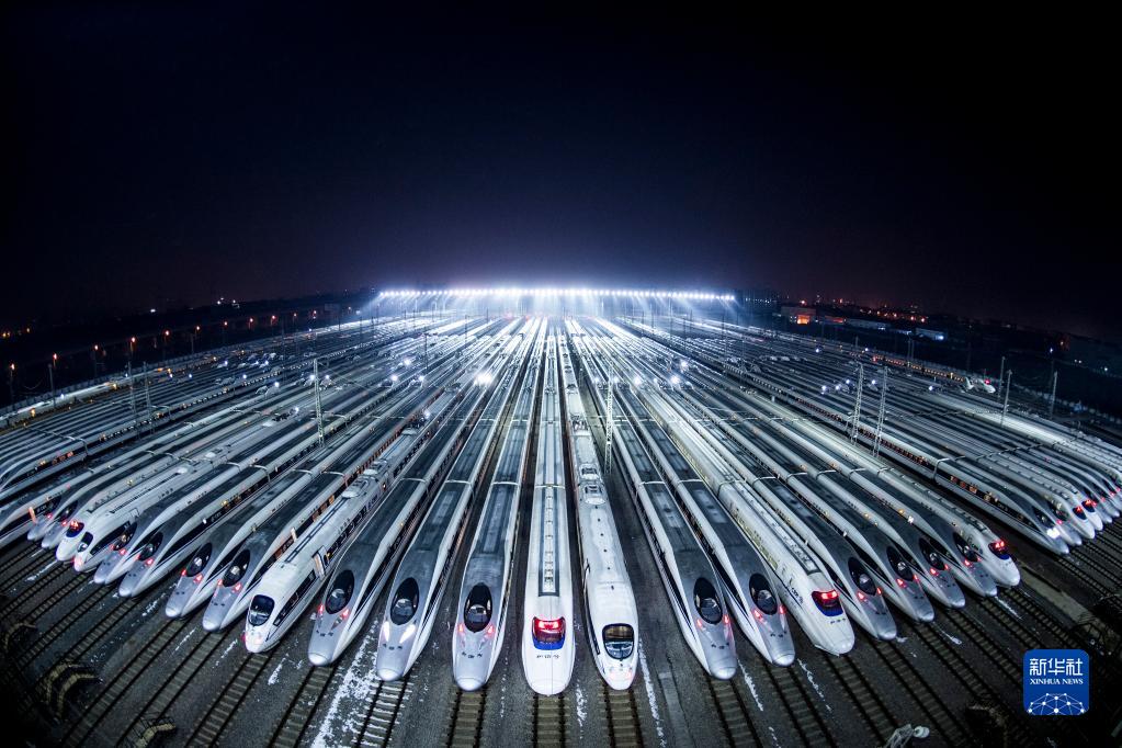 動(dòng)車(chē)組??吭谖錆h動(dòng)車(chē)段的存車(chē)線(xiàn)上,準(zhǔn)備進(jìn)行檢修和保溫作業(yè)(2018年2月1日攝)。新華社記者 肖藝九 攝