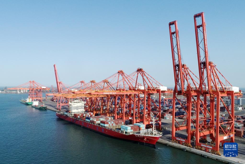 一艘輪船靠泊在唐山港京唐港區(qū)集裝箱碼頭裝貨(4月8日攝,無(wú)人機(jī)照片)。新華社記者 楊世堯 攝
