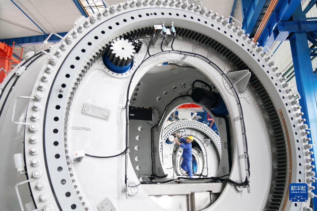 在位于黑龍江省齊齊哈爾市的中國(guó)一重集團(tuán)有限公司風(fēng)電裝備生產(chǎn)制造廠生產(chǎn)車(chē)間,工人在進(jìn)行生產(chǎn)作業(yè)(7月1日攝)。新華社記者 王建威 攝