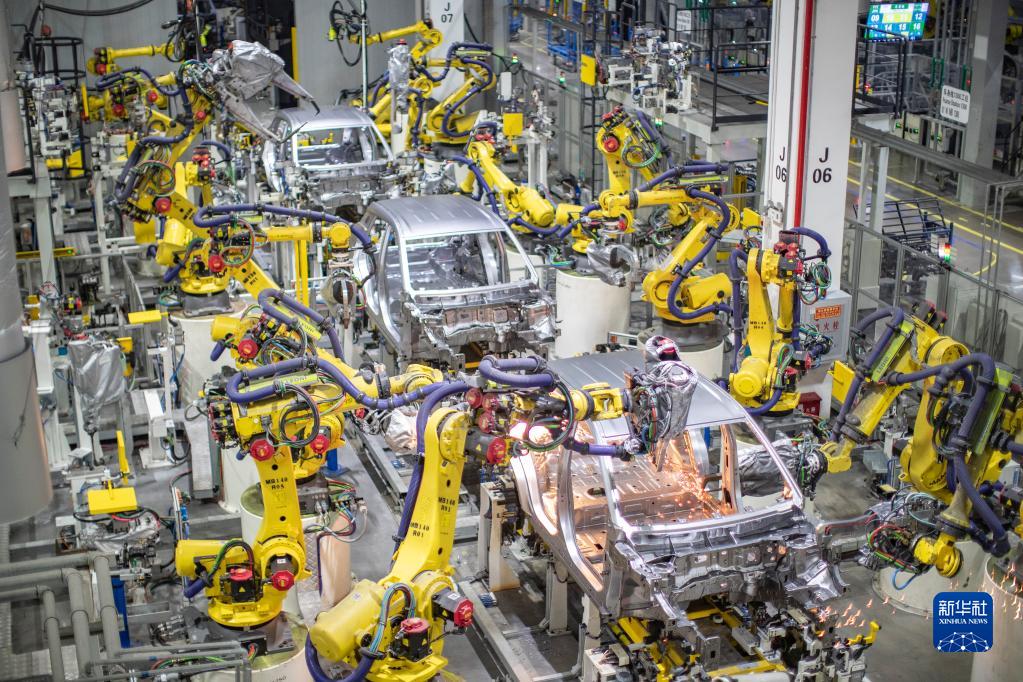 在重慶金康新能源汽車(chē)有限公司,智能化焊接機(jī)器人在進(jìn)行焊接作業(yè)(4月2日攝)。新華社記者 黃偉 攝