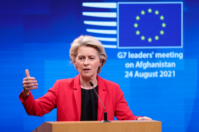 8月24日,在比利時布魯塞爾,歐盟委員會主席馮德萊恩在記者會上發(fā)言。(新華社記者鄭煥松攝)