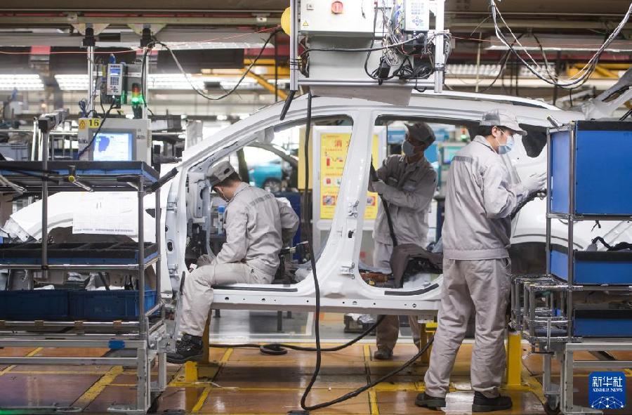 2020年3月24日,工人在湖北武漢東風(fēng)乘用車(chē)公司工廠總裝車(chē)間的流水線上作業(yè)。2020年3月下旬左右,武漢各企業(yè)開(kāi)始陸續(xù)復(fù)工復(fù)產(chǎn)。新華社記者 肖藝九 攝