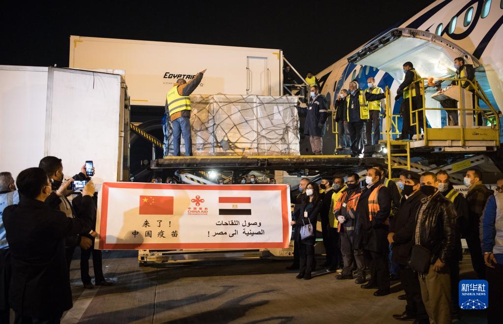 2月23日,在埃及開(kāi)羅國(guó)際機(jī)場(chǎng),工作人員運(yùn)輸疫苗。中國(guó)援助埃及的首批新冠疫苗當(dāng)日凌晨運(yùn)抵開(kāi)羅,援助阿盟秘書處的新冠疫苗也同機(jī)抵達(dá)。新華社記者 鄔惠我 攝