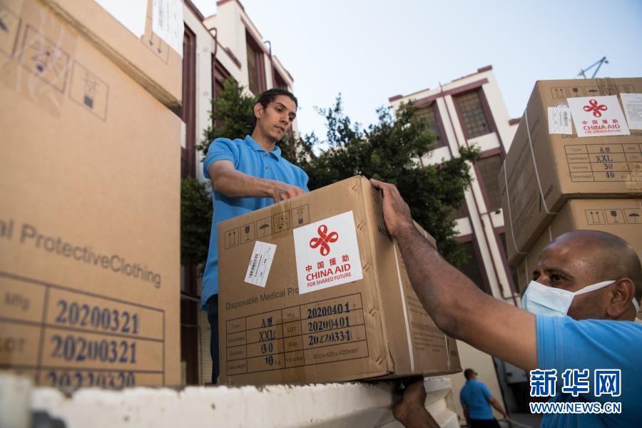 5月10日,在埃及首都開羅,工作人員搬運(yùn)中國(guó)政府援助的第二批抗疫物資。新華社記者 鄔惠我 攝