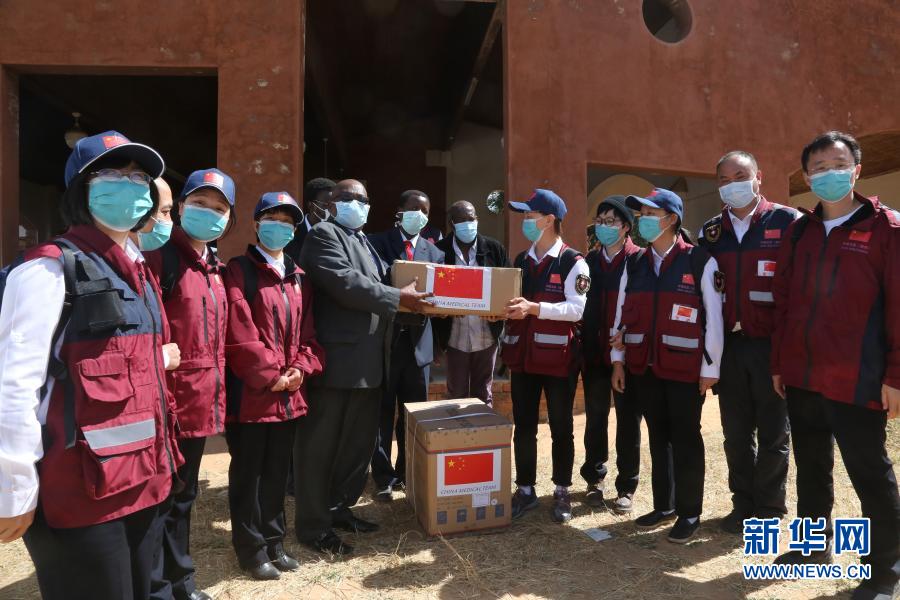 5 月 19 日,在津巴布韋中馬紹納蘭省的姆武爾維醫(yī)院,中國(guó)抗疫醫(yī)療專家組為當(dāng)?shù)蒯t(yī)療機(jī)構(gòu)捐贈(zèng)醫(yī)療物資。新華社記者 張玉亮 攝