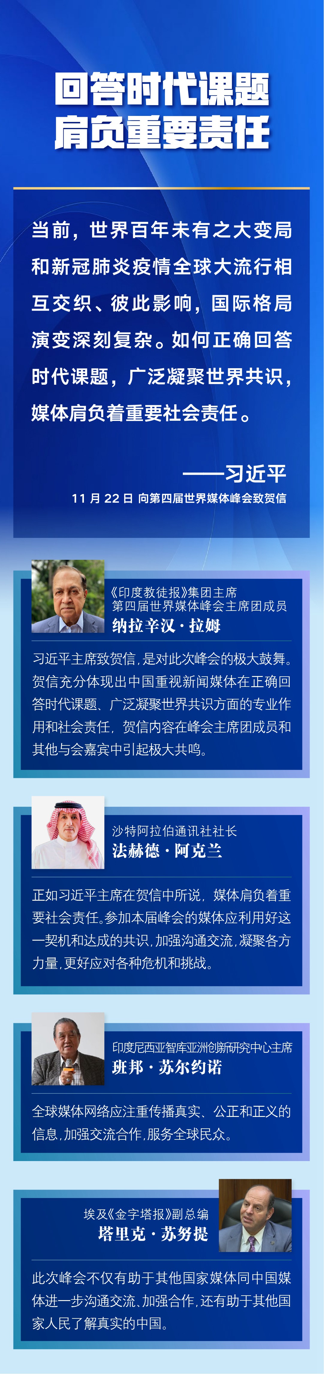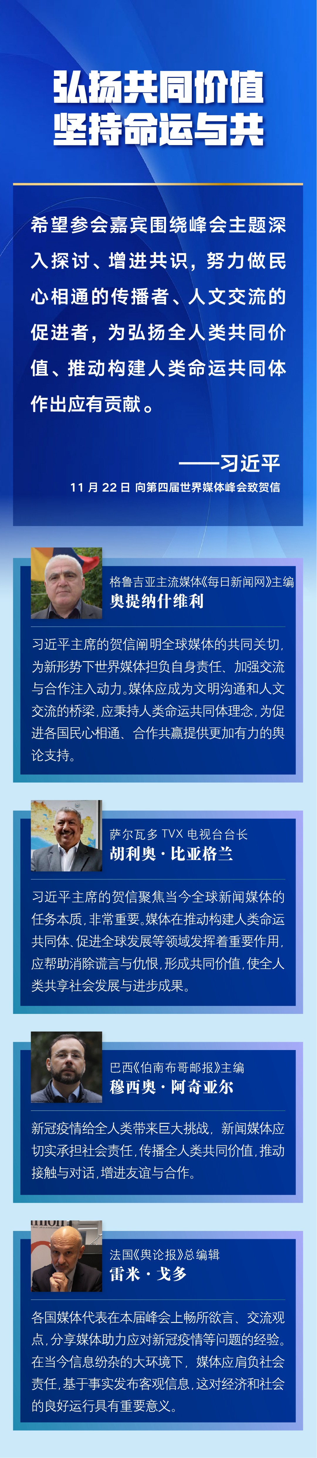 多國媒體人士認(rèn)為,習(xí)近平主席的賀信對全球媒體更好肩負(fù)社會責(zé)任、廣泛凝聚世界共識作出重要闡述,為新形勢下世界媒體加強(qiáng)交流與合作、弘揚(yáng)全人類共同價(jià)值、推動構(gòu)建人類命運(yùn)共同體注入新的推動力——