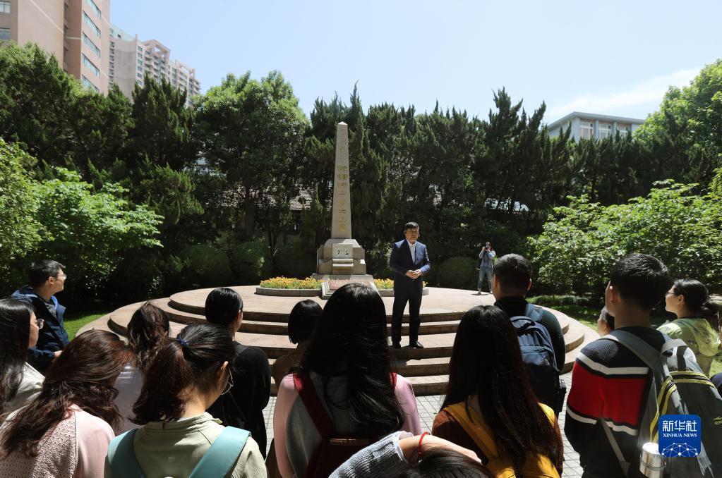 在上海交通大學校園里的史霄雯、穆漢祥烈士墓前,劉統(tǒng)教授在講述兩位烈士犧牲的歷史經(jīng)過(2019年5月7日攝)。新華社記者劉穎攝