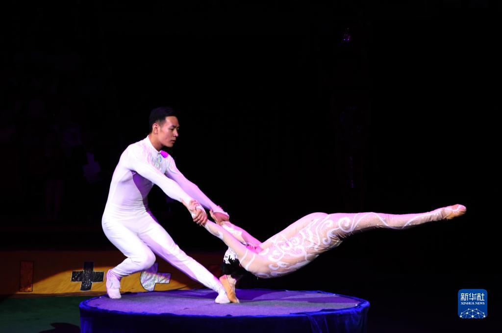 2019年9月4日,在蒙古國首都烏蘭巴托,中國河北省滄州市雜技團演員表演雜技。新華社發(fā)(蘇力雅 攝)