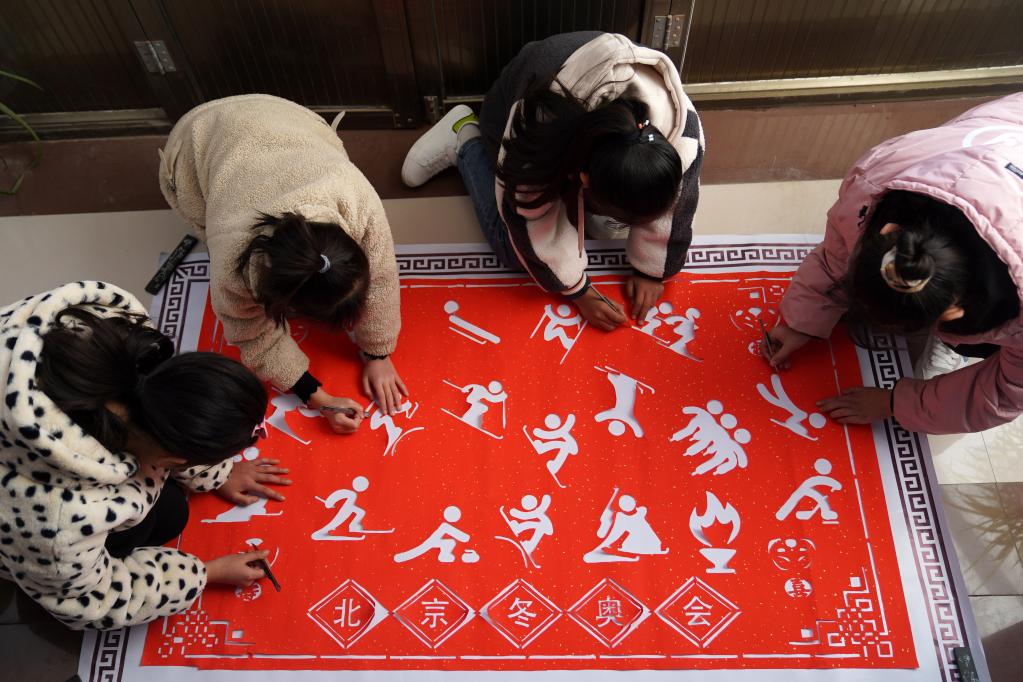 農歷壬寅年到來之際,在河北省臨城縣東鎮(zhèn)鎮(zhèn)南孟村,村民圍繞“迎冬奧”主題剪紙。新華社發(fā)(陳雷攝)
