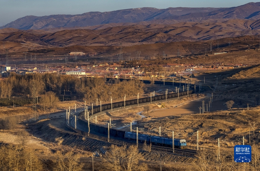 2021年12月23日,一列萬(wàn)噸煤炭列車行駛在內(nèi)蒙古烏蘭察布市卓資縣境內(nèi)。新華社發(fā)(紀(jì)恩泉 攝)