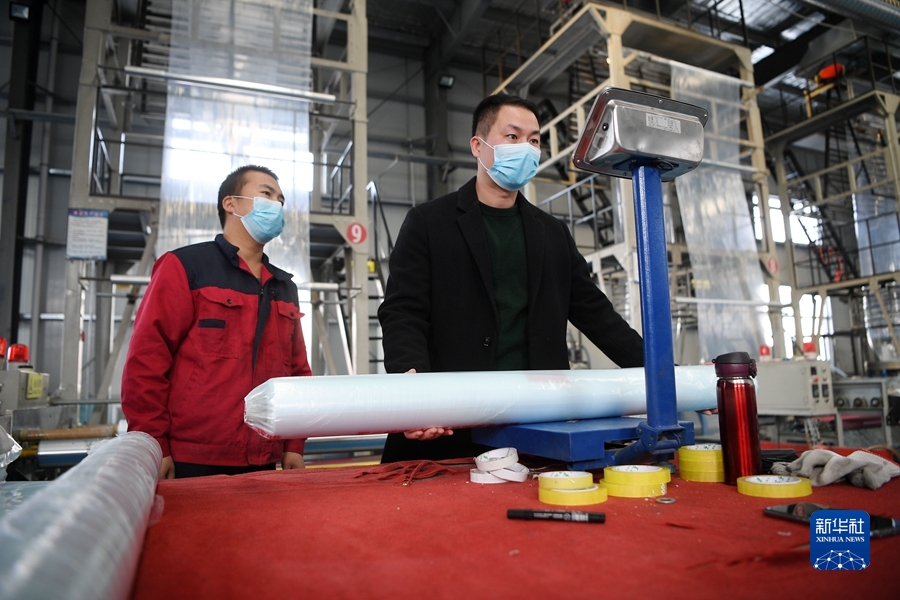 2022年1月28日,閩商鄭開(kāi)煌(右)在位于寧夏隆德縣閩寧扶貧產(chǎn)業(yè)園的農(nóng)用薄膜生產(chǎn)線查看產(chǎn)品質(zhì)量。新華社記者 王鵬 攝