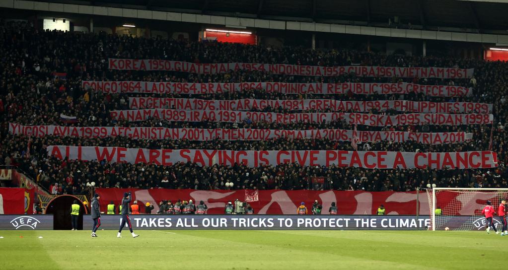 3月17日,在塞爾維亞首都貝爾格萊德舉行的一場足球比賽中,塞爾維亞觀眾拉起多條橫幅,細(xì)數(shù)美國、北約過去幾十年來轟炸或挑起戰(zhàn)爭的國家和地區(qū)名單,并高唱反戰(zhàn)歌曲,以此諷刺西方在“反戰(zhàn)”方面的雙重標(biāo)準(zhǔn)。(新華社發(fā),普雷德拉格·米洛薩夫列維奇攝)