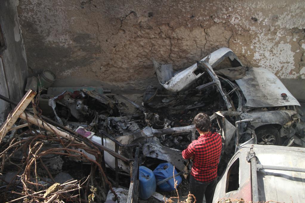 2021年9月2日,阿富汗喀布爾一處被美軍空襲過的居民區(qū)的居民站在汽車殘骸旁。(新華社發(fā),塞夫拉赫曼·薩菲攝)