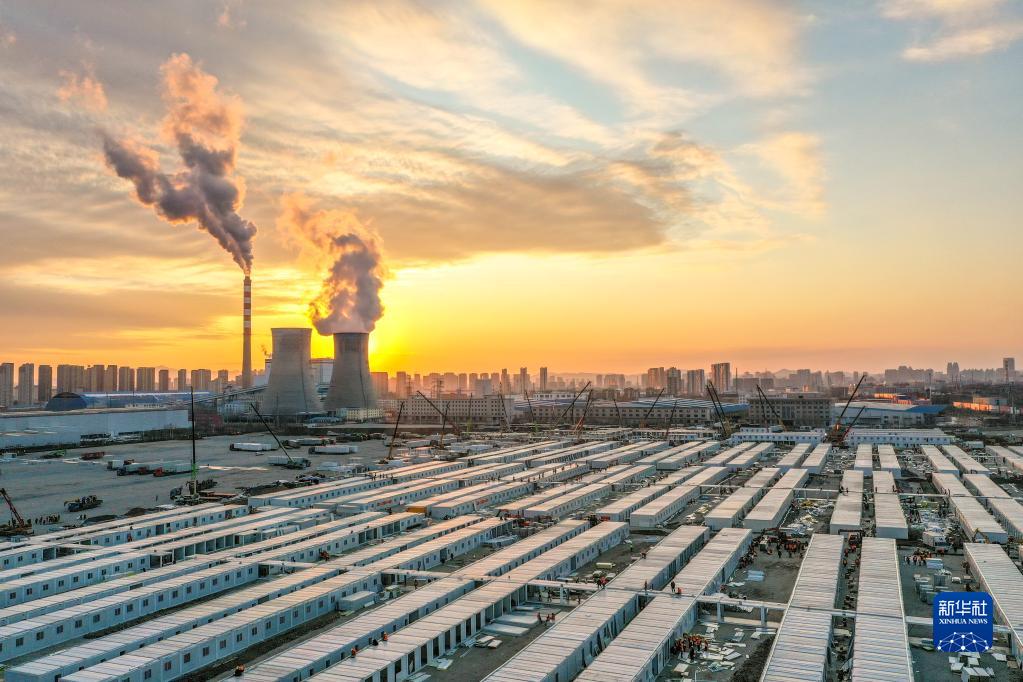 這是3月20日傍晚拍攝的吉林市高新南區(qū)隔離方艙建設(shè)現(xiàn)場(chǎng)(無人機(jī)照片)。新華社記者 張楠 攝