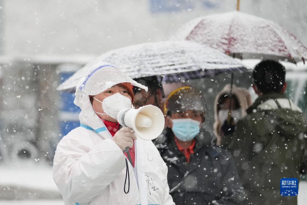 3月18日,在北京市東城區(qū)北新橋街道一處核酸采樣點(diǎn),工作人員冒雪引導(dǎo)前來檢測(cè)的居民。新華社記者 鞠煥宗 攝
