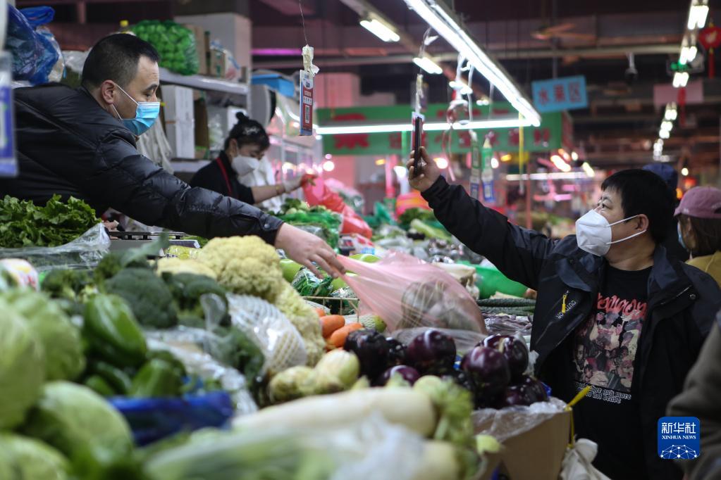 3月25日,在遼寧省沈陽市鳳祥綜合市場(chǎng),一名市民買菜后掃碼付款。新華社記者 王乙杰 攝