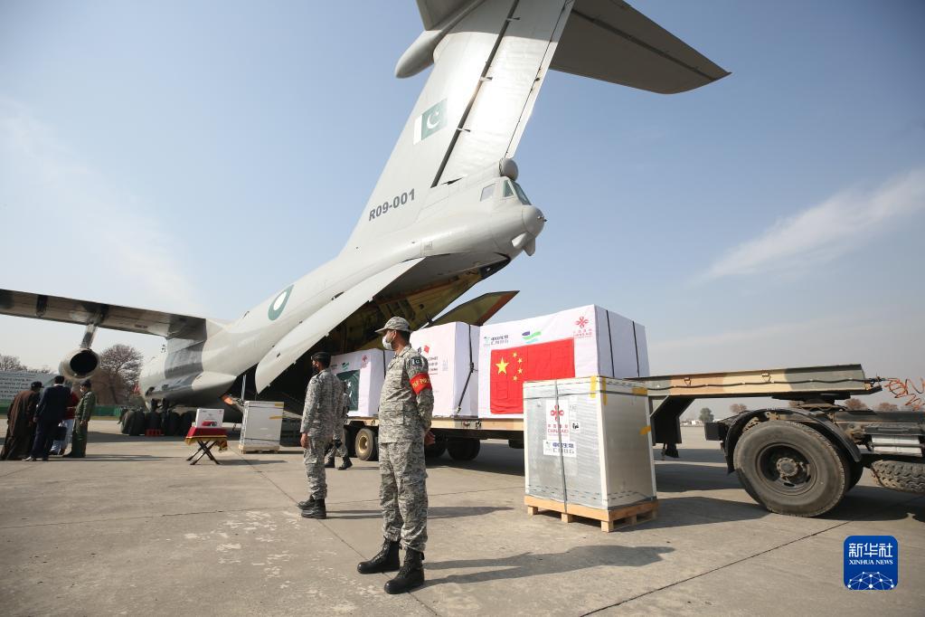 這是2021年2月1日在巴基斯坦首都伊斯蘭堡附近的努爾汗空軍基地拍攝的中國(guó)政府援助新冠疫苗交接儀式現(xiàn)場(chǎng)。新華社記者 劉天 攝