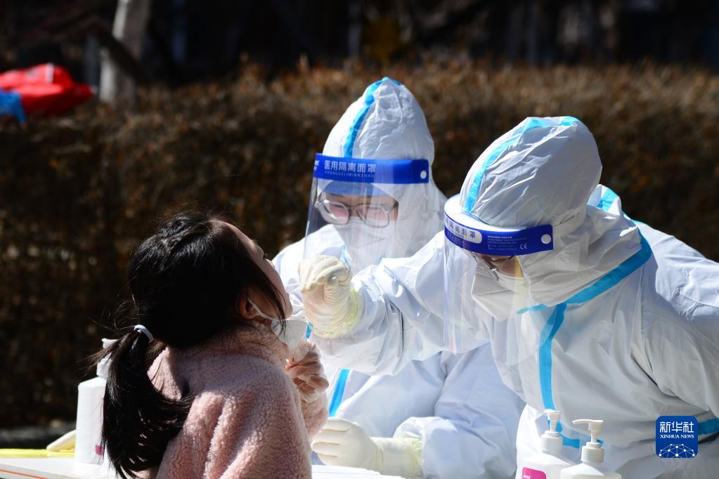4月7日,在長春市南關(guān)區(qū)一處核酸檢測(cè)點(diǎn),醫(yī)務(wù)人員為居民進(jìn)行核酸采樣。新華社記者 張建 攝