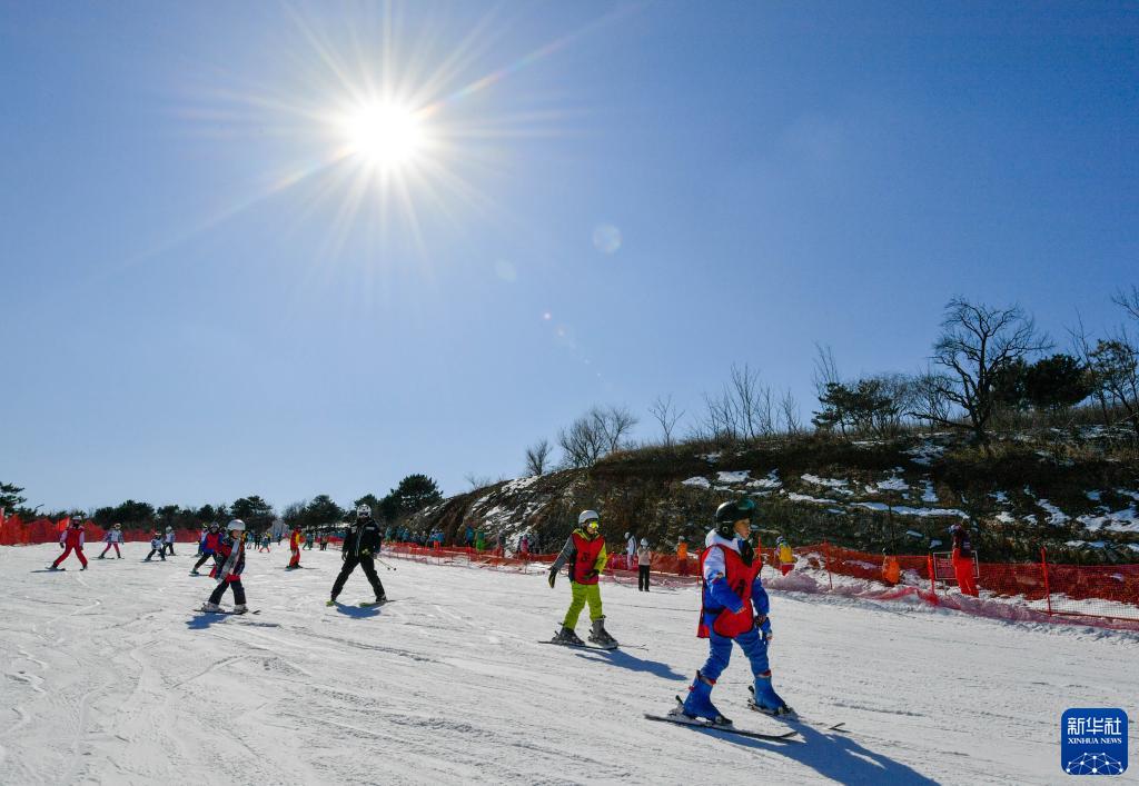 在天津薊洲國(guó)際滑雪場(chǎng),教練與小朋友在雪道上練習(xí)滑雪(2月20日攝)。新華社記者 孫凡越 攝