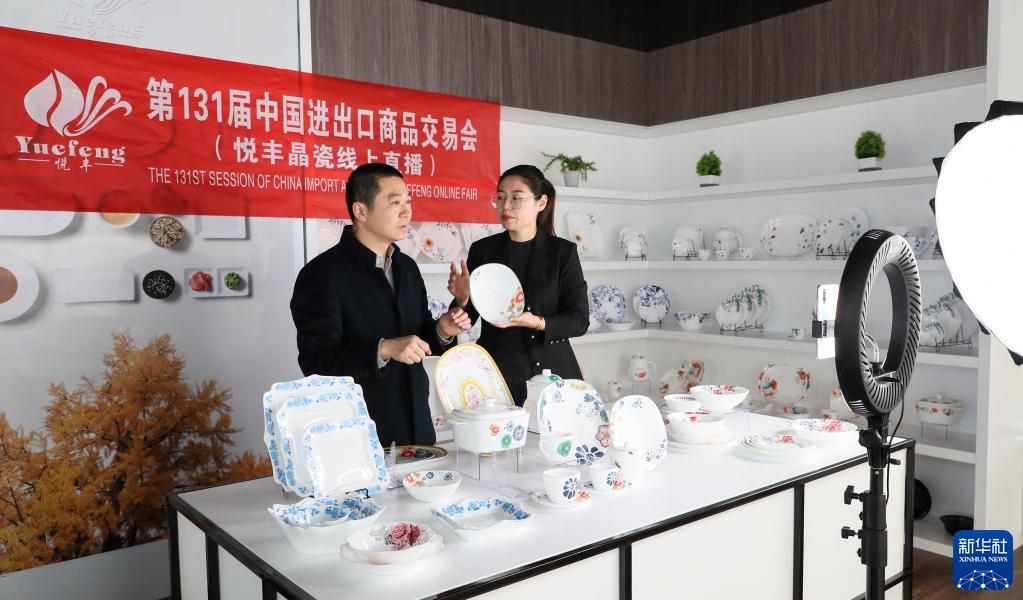 4月15日,第131屆中國(guó)進(jìn)出口商品交易會(huì)線上開幕。在江蘇省淮安市洪澤區(qū),一家陶瓷企業(yè)的工作人員在展廳直播介紹產(chǎn)品。新華社發(fā)(趙啟瑞 攝)