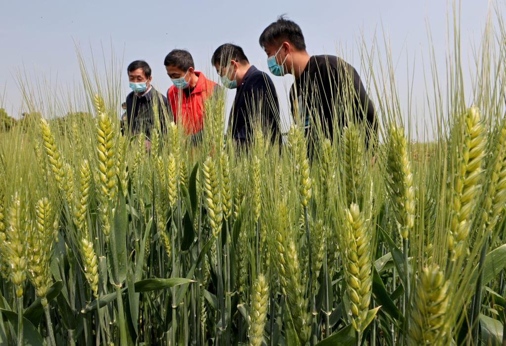 4月19日,在安徽省滁州市全椒縣大墅鎮(zhèn)大墅村,農(nóng)技人員指導種植大戶防治小麥赤霉病。新華社發(fā)