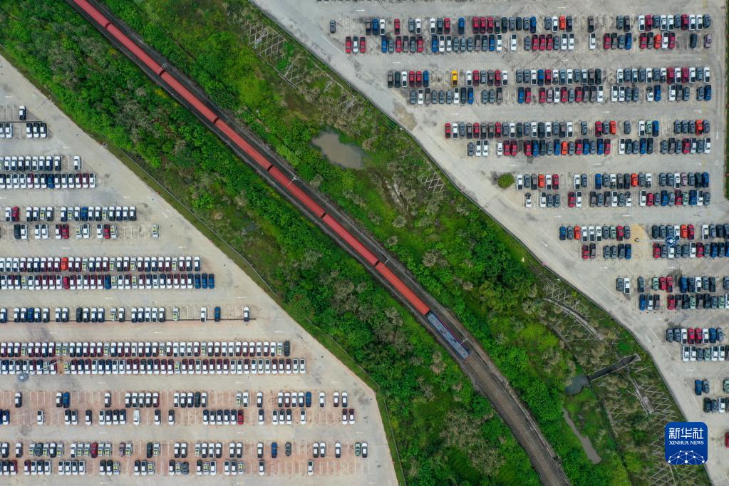 長城汽車專列首發(fā)列車在重慶永川國家高新區(qū)鐵路專用線上(4月14日攝,無人機(jī)照片)。新華社記者 唐奕 攝