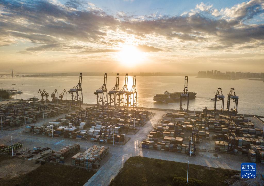 這是2021年12月5日清晨在海南洋浦經(jīng)濟(jì)開發(fā)區(qū)拍攝的海南自貿(mào)港建設(shè)重要的集裝箱航運(yùn)樞紐——洋浦國際集裝箱碼頭(無人機(jī)照片)。新華社記者 蒲曉旭 攝