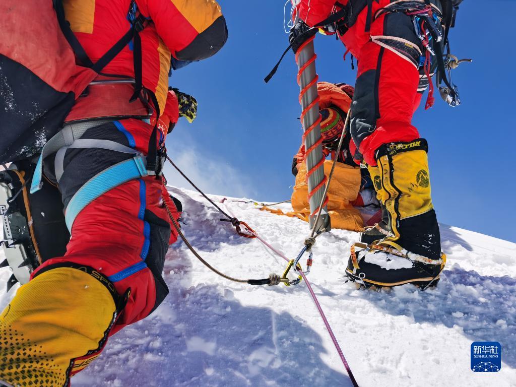 5月4日,科考隊員登上珠穆朗瑪峰峰頂。新華社特約記者 索朗多吉 攝