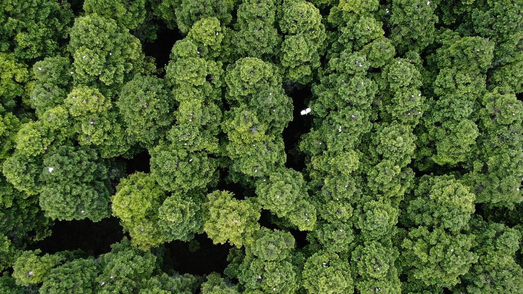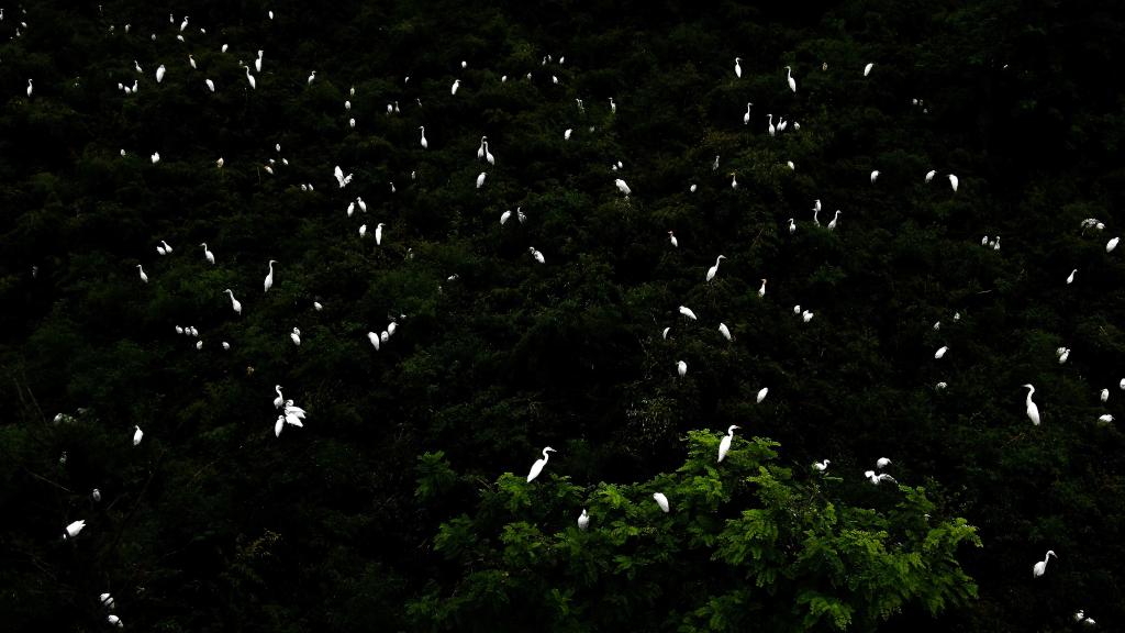 在江蘇省大豐麋鹿國家級自然保護(hù)區(qū),大量白鷺在樹頂棲息。(無人機(jī)拍攝)新華社記者李響攝