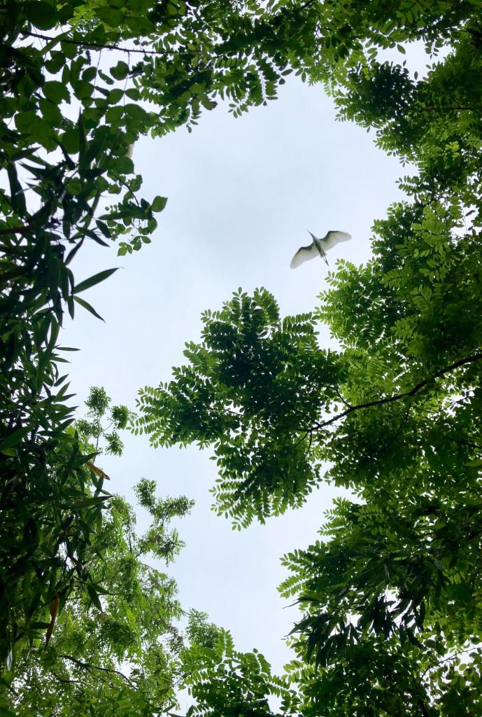 在江蘇省大豐麋鹿國家級自然保護(hù)區(qū),一只白鷺飛過樹梢。新華社記者李響攝