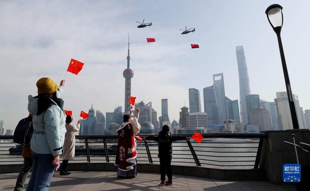 兩架懸掛國旗和警旗的警航直升機飛過上海外灘,慶祝首個“中國人民警察節(jié)”(2021年1月10日攝)。新華社記者 方喆 攝