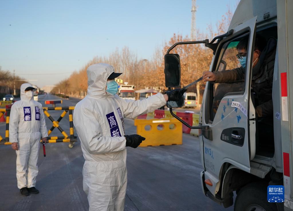 石家莊市公安局高新技術(shù)產(chǎn)業(yè)開發(fā)區(qū)公安分局民警在藁城區(qū)通往市區(qū)的路口執(zhí)勤(2021年1月10日攝)。當日是首個“中國人民警察節(jié)”。新華社記者 楊世堯 攝