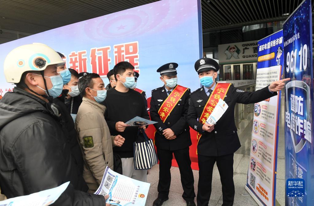 在廣西南寧東站,南寧鐵路公安處民警向旅客宣傳防電信詐騙常識(2022年1月9日攝)。新華社記者 陸波岸 攝