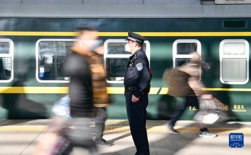 北京鐵路公安局天津鐵路公安處乘警支隊四大隊民警高天順在天津站執(zhí)勤(2021年2月3日攝)。新華社記者 孫凡越 攝