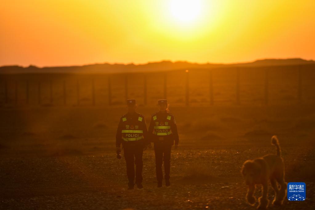 內(nèi)蒙古阿拉善邊境管理支隊銀根邊境派出所戍邊夫妻警務(wù)室的徐乃超和李文娜在邊境線附近巡邏(2022年4月18日攝)。新華社記者 彭源 攝