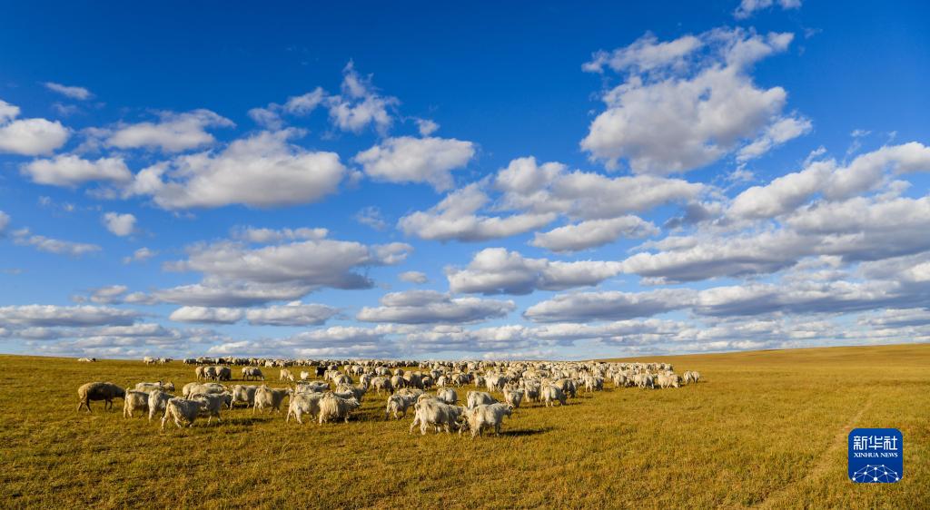 內蒙古錫林浩特市寶力根蘇木上的羊群在覓食(2017年9月16日攝)。新華社記者 連振 攝