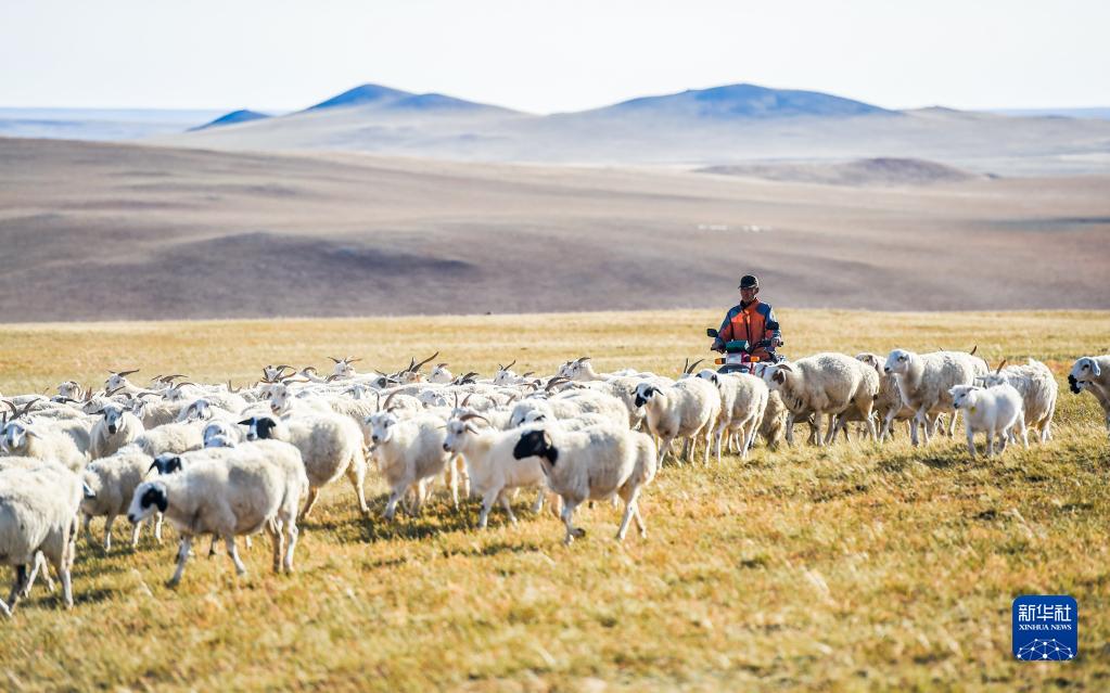 內蒙古錫林浩特市寶力根蘇木牧民瑪吉格的兒子鋼蘇格拉在草原上放羊(2017年9月16日攝)。新華社記者 連振 攝