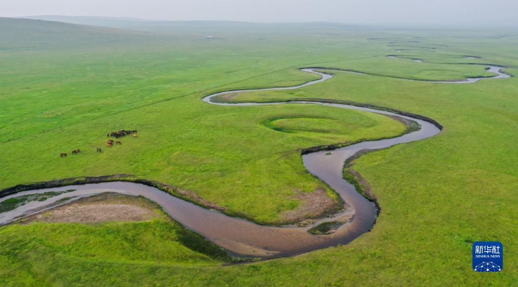 這是內蒙古錫林郭勒盟東烏珠穆沁旗乃林高勒的草原風光(2021年7月12日攝,無人機照片)。新華社記者 連振 攝