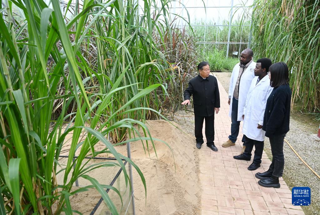 2021年11月23日,福建農林大學菌草專家林占熺(左一)在國家菌草工程技術研究中心菌草種質資源圃給外國留學生(左二、左三)講解菌草的種植培育技術。新華社記者 林善傳 攝