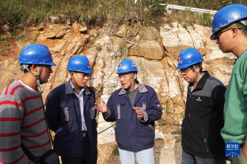 天文學家南仁東(中)與工程技術人員在大窩凼施工現(xiàn)場檢查施工進展(2014年12月1日攝)。新華社發(fā)(中科院國家天文臺供圖)